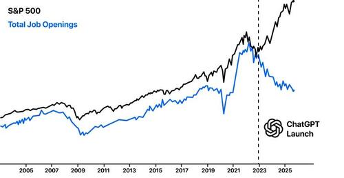 One Little ‘K’… And The End Of America Authored by Adam Sharp via DailyReckoning.com, A disturbing chart is making waves in the financial world. It’s a long-term view of job openings (blue) vs the S&P 500 (black). The dotted line shows when ChatGPT launched in November of 2022. Take a look: Digesting this chart gives me heartburn. As you can see, historically job openings and the stock market have moved in parallel. […]